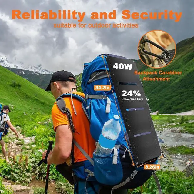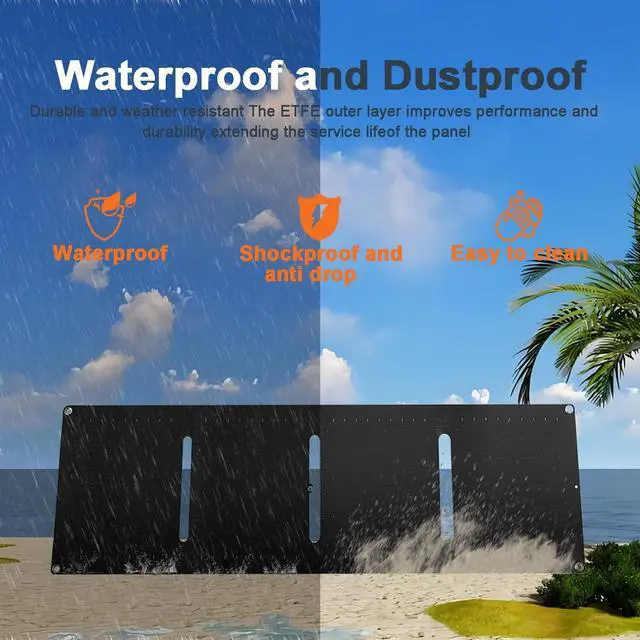 The built-in smart charging technology can provide optimal and 100% safe charging in direct sunlight. DURABLE & WIDE USEThe 40 watt portable solar panels utilizes ETFE coating material and Solar panels are made of Waterproof Dragon Dance Cloth which can withstand any outdoor conditions. NOTE. The portable solar panels can withstand light rain and snow as well as perfect for outdoor activities such as camping hiking picnics caravan RV car boat off-grid living and unexpected power outages. However the output control box is not waterproof in order to prolong the lifespan of 40watt solar panel please don't soak it into water.