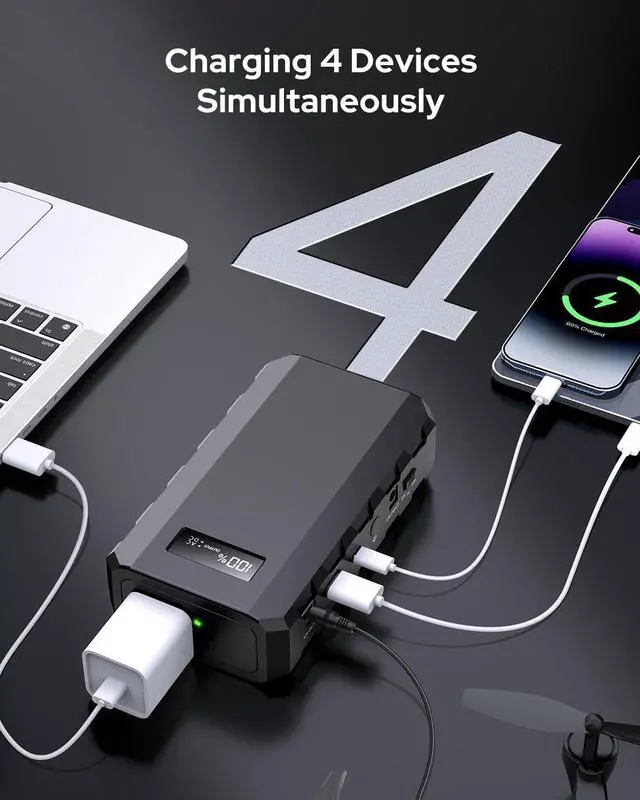 Output Ports: This portable power bank has 4 outputs ports 1 *USB-A (5V/3A 9V/2A) & USB-C ports(5V/3A 9V/ 2.7A 12V/ 1.5A ) 1*DC port(9V~ 12.6V /10A Max) 1*AC(110V/65W) output which means the portable power station can charge multiple devices at the same timeEasy to