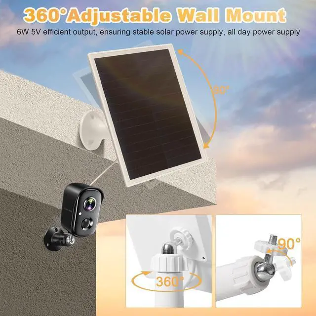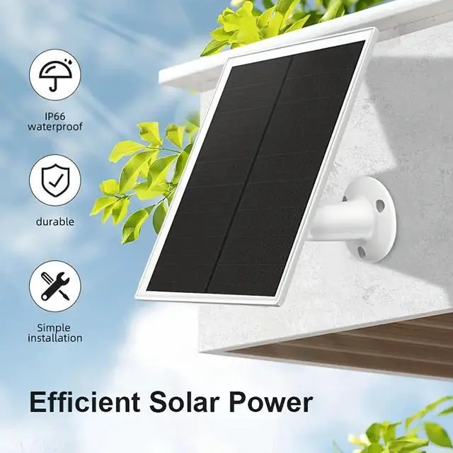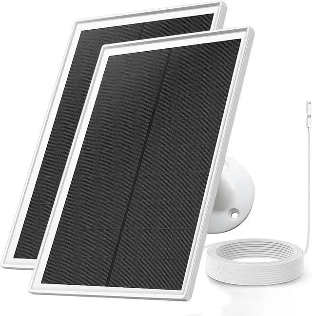 Compatible withSolar Panel Compatible with Arlo Essential 2K Outdoor (2nd Gen) /Essential XL Camera (2nd Gen) /Essential Spotlight Eufycam 2C/2C Pro/E40/E20/2/2 Pro/E or other security camera with typeC and Micro USB plug chargerWaterproofIP66 Waterproof Dustproof -20°-50° heat resistantCold resistant make your use more reassuringEasy to Install The flexibility of the 360 °+90 ° bracket allows the solar panel to better face sunlight from any angle and the installation is simple with all accessories included for installationPackages Include2x Security Camera Solar Panel 2 X 3m( 9.8 ft) Cable with typeC and Micro USB plug charger 2 X 360-Degree Mounting Bracket 2 pack Circle cable clips with steel nail Camera Not Included.