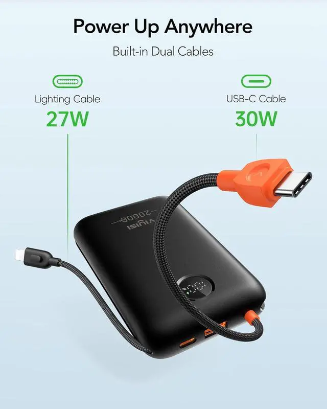 Super-Fast Charging: Charge your devices quickly with our cutting-edge 30W technology; compatible with PD 3.0 and QC 3.0 this portable charger outpaces typical 20W and 22.5W options delivering a faster and more efficient charging experienceBuilt-In Cables for