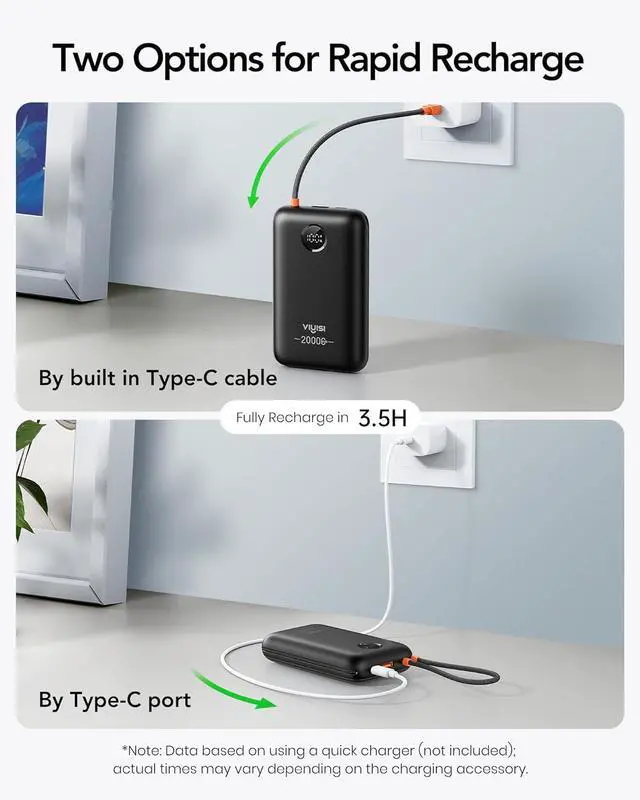 Recharge: Fully charges the portable charger itself in just 3.5 hours using the built in USB-C cable or USB-C port at 20V/ 1.5A input (note: quick charger not included); this ensures you're always ready to go saving you valuable timeClear LED Display & Advanced Safety Features: Effortlessly monitor battery levels with the digital display; the integrated smart safety chip provides advanced protection against overcharge over-discharge and short-circuit ensuring safe and reliable use