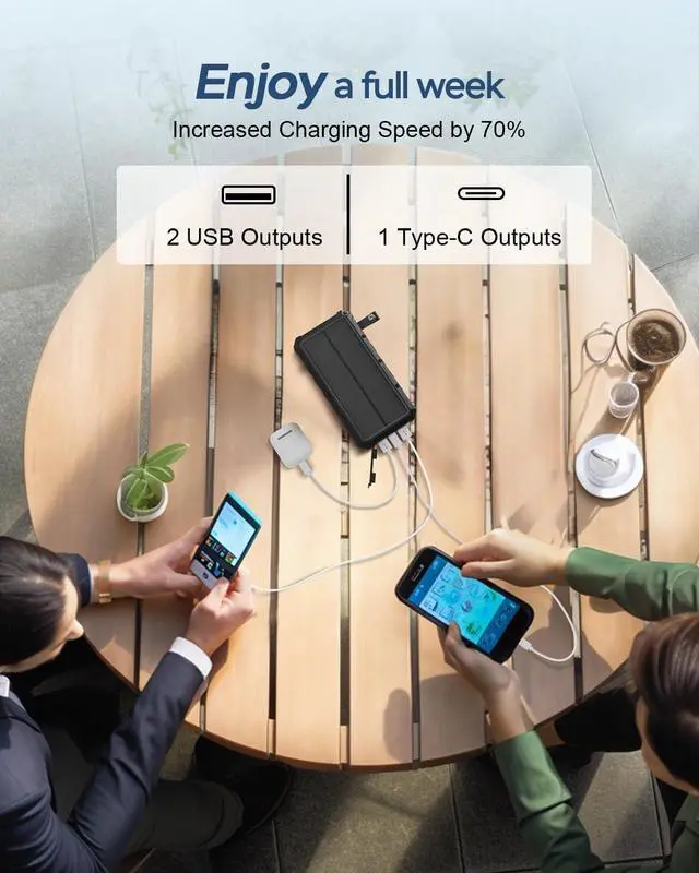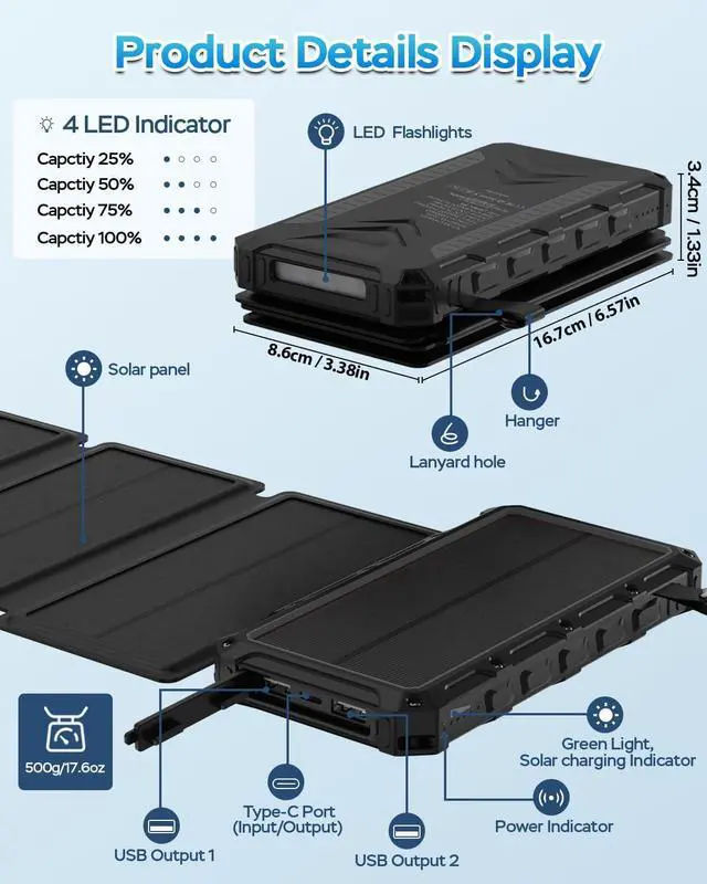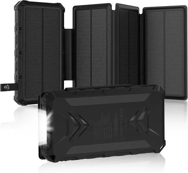 20000mAh Ultra-large CapacityWith the capacity of 20000mAh it can charge most smartphones for 5-8 times tablets for 1.5 - 2.5 times. 3A High-Speed 3 Outputs and 2 InputsSupports up to 3 electronic devices to charge simultaneously. Three fast output ports (Two USB and a Type-C ) charging for your phone tablet or other electronic devices. Two intputs (USB-C Port & Solar Panels)Provides higher efficiency and faster charging speed for power bank charging. 4 Solar Panels Power of about 8WWith 4 high-efficiency foldable solar panels it's up to 1A input under the direct sunlight which is 4- 6 times faster than the other solar chargers.