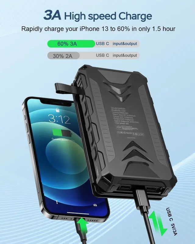 But solar charging for emergency use to ensure battery life it is recommended that daily use of cable charging. Perfect for Outdoor EnthusiastsIP66 rain-proof dust-proof shock-proof and splash-proof. Built-in a LED flashlight with 3 modes (lighting/ flashing/ SOS) which can be used as camping lamp emergency lamp and rescue signal lamp. Equipped with solar panel just hang it on your backpack to get recharge via sunlight. It's perfect for outdoor activities like camping hiking and other emergencies. What You Will Get1 X 2023 Newest 20000mAh portable solar charger 1X USB cable 1X User manual.