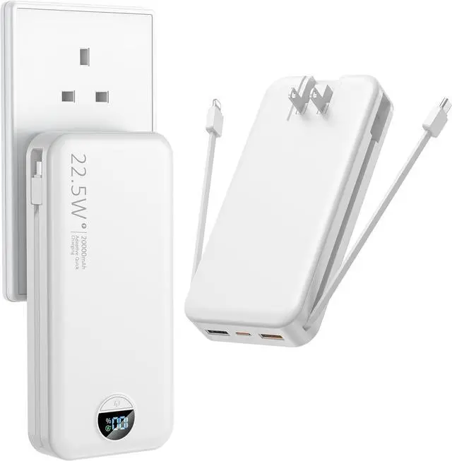 Portable Charger with Wall Plug, 20000mAh USB C Power Bank Fast Charging, External Battery Pack with Built in Cables, Digital Display, 5 Output 2 Input for iPhone Android Cell Phone Tablet