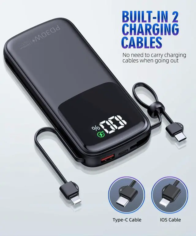 Fast Charger: Portable charger power bank Type-C port supports PD30W, USB-A port and Type-C Cable support SCP 22.5W fast charging. Keeping your electronic devices fully charged in short time, bringing you a pleasant experience of fast charging. (Please note that Type-C cable do not support charging iPhone 15. )
