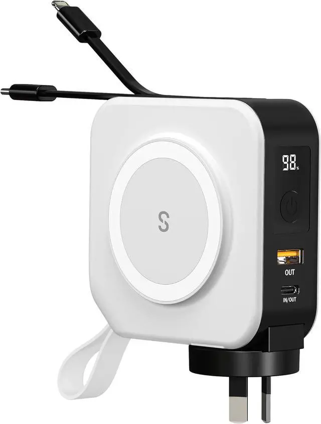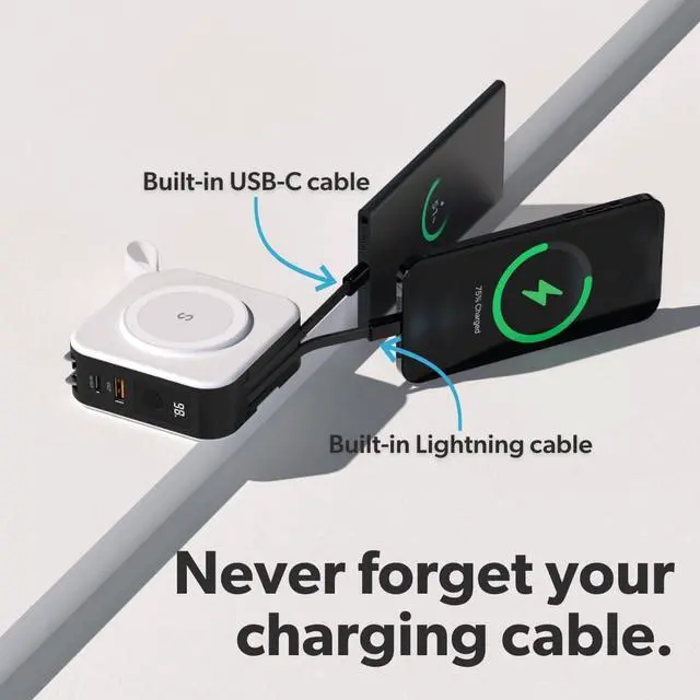 PD 20W Fast Charge with Integrated Cables Transform your charging experience with PD 20W technology for rapid device charging. Say goodbye to cable clutter with built-in Apple Lightning and USB-C cables, streamlining your tech essentials in one sleek package.