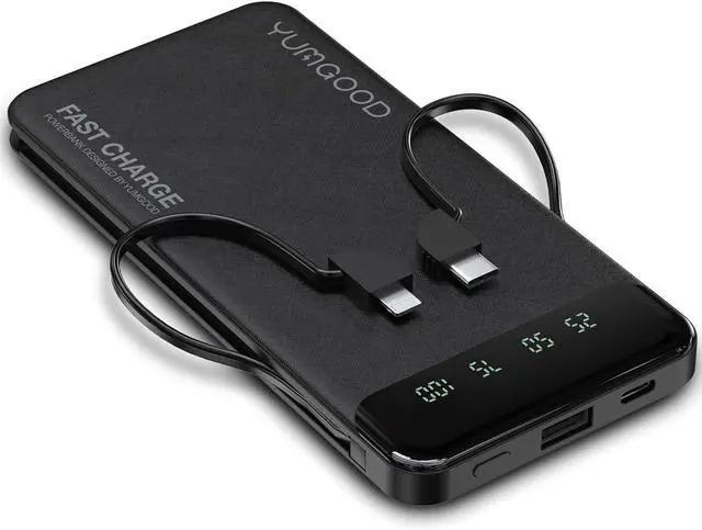 Portable Charger with Built-in Cables, Slimmest 10000mAh Fast Charging Power Bank, Dual USB C in&Out High-Speed Charging Battery Pack