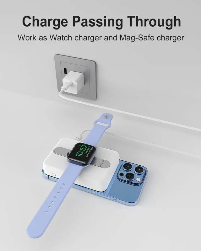 Charging Pass-Through Supported - When being plugged in, the wireless portable charger still can be used as a mag-safe charger and watch charger to charge iPhones, AirPods Pro, and Apple Watches
