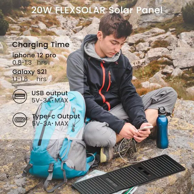 CHARGE MULTIPLE DEVICES The FlexSolar 20w solar panel designed with 2 output ports: 1*USB A ( 5V/3A Max), 1*USB C( 5V/3A Max), compatible with smartphone, GPS, USB fan, camera, small devices (within 19V ), etc.