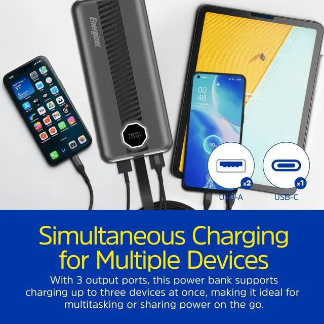 Energizer UE30029PQ is a compact yet powerful 30,000mAh power bank designed to keep your devices charged throughout the day. Featuring triple outputs: two Smart USB-A ports and one USB-C with Power Delivery, it allows you to charge multiple devices simultaneously with high-speed efficiency. The USB-C PD 30W technology delivers fast charging for the latest iPhones, reaching 50% battery in just 30 minutes, while the Smart USB-A ports support up to 22.5W fast charge for compatible Android devices including Samsung and Huawei. With dual input options via USB-C and micro-USB, recharging the power bank is flexible and convenient. Built with Energizers PowerSafe Management system, the UE30029PQ ensures reliable protection against short circuits, overcurrent, overcharging, and overdischarging, safeguarding both the power bank and your devices. Sleek, durable, and universally compatible, its the ideal portable charger for smartphones, tablets, and other USB-powered gadgetsperfect for travel, work, or everyday use.