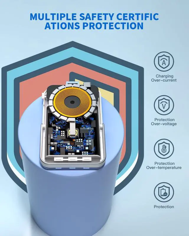 This magnetic power bank features multiple protection functions, including prevention against over-heating, over-current, short-circuit, etc. Built-in intelligent protection, Fast heat dissipation effectively avoids affecting the performance of internal components due to overheating and prolongs the service life.