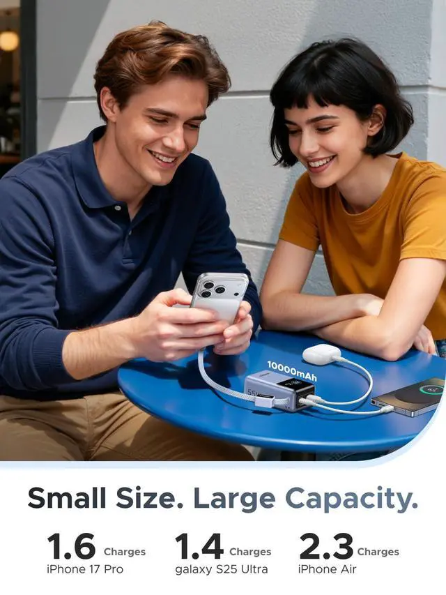 10,000mAh Capacity Reliable All-Day Power Provides 1.6 charges for iPhone 17 Pro, giving you enough power for a long workday, a full city commute, or a short business tripwithout hunting for outlets.
