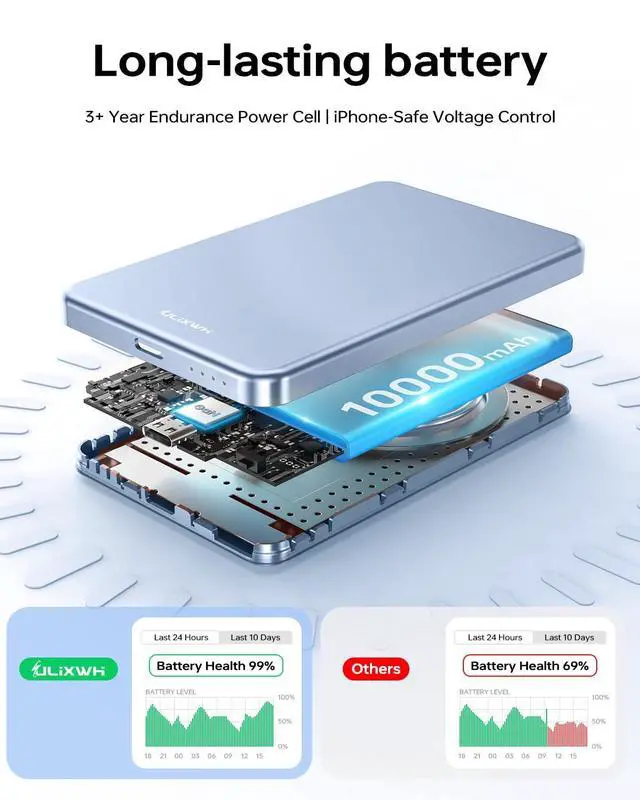 [ 10,000mAh in Ultra-Slim Design ] Tired of choosing between bulky power banks and weak 5,000mAh chargers? Meet the ULiXWH 10,000mAh MagSafe Pro: ultra slim (0.55") yet stores enough power for 2.3 iPhone charges. Perfectly sized for pockets or minimalist wallets. Travel light, stay powered all day