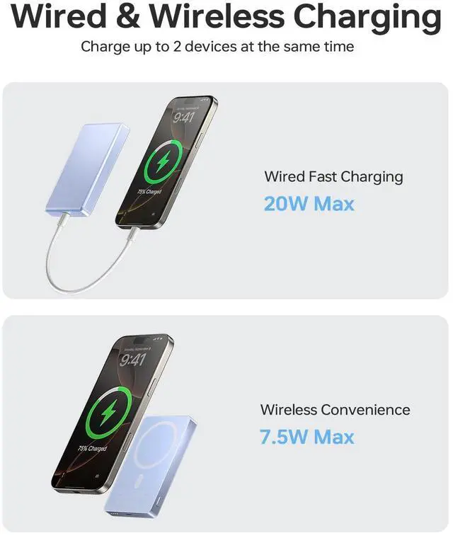 [ Fast Wireless Charging Power Bank ] Equipped with an advanced lithium-polymer battery and NTC temperature control chip, this 10,000mah ultra-slim power bank delivers 3x faster charging. Supports 20W wired and 15W wireless charging (7.5W for iPhone) Smarter than ever, charging slows after 75% to prevent overheating & extend battery life
