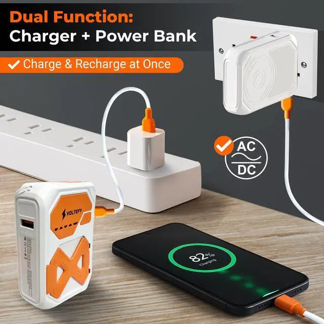 Built-In AC Plug This power bank with wall plug unfolds to charge directly from an outlet, eliminating extra adapters. Portable power bank with ac outlet + USB-C ensures versatile charging.