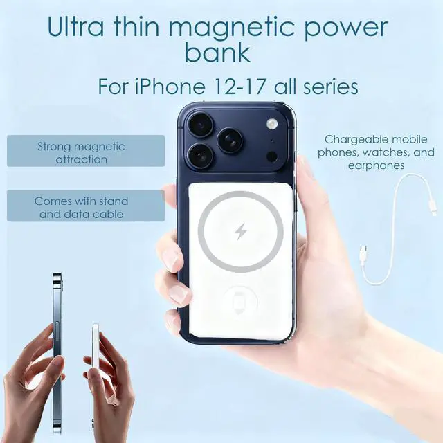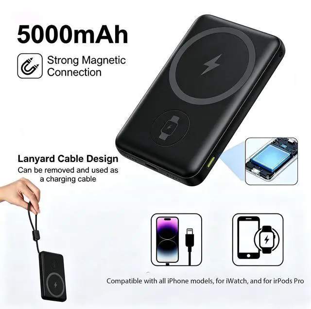 Experience versatile charging with the 5000mAh Foldable Magnetic Power Bank, designed for seamless compatibility with a wide range of iPhone models, including the iPhone 12, 13, 14, 15, 16, and 17 series, as well as Plus, Pro Max, and Air variants. This 3-in-1 portable battery pack supports simultaneous charging of your iPhone, Apple Watch, and AirPods, making it an essential accessory for users of multiple Apple devices. Featuring 20W fast charging capability, it ensures rapid power delivery for your devices, minimizing downtime. The foldable magnetic design offers secure attachment and convenient portability, while the compact form factor allows for easy storage and travel. Built for efficiency and reliability, this power bank is ideal for professionals, travelers, and anyone seeking dependable power on the go.