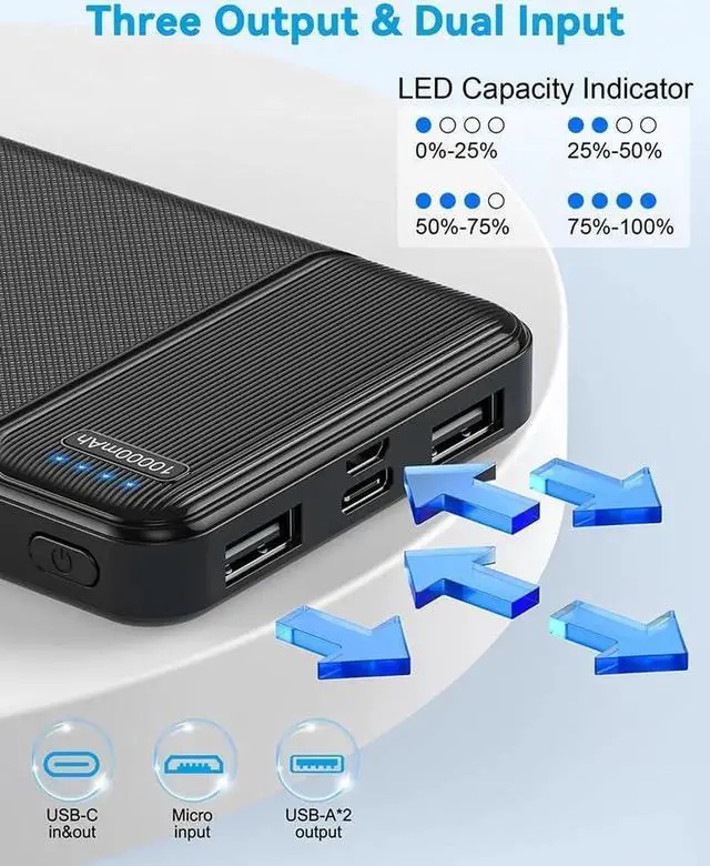 [10000 mAh Power Bank Pack of 2] These two 10000 mAh portable chargers are small enough to go into any pocket or backpack. These battery packs are powerful enough to last the entire day. Each one charges the iPhone X 2.4 times the iPhone 8 3.6 times[Charge THREE at Once] With one USB-C port and two USB ports built-in it can juice up THREE devices simultaneously. Triple-port design allows you to share portable power with families and friends[USB C Input & Output] Upgrade portable battery charger has a USB-C In & Out port to perfectly fit your new iPhones iPad and all upcoming USB-C devices.