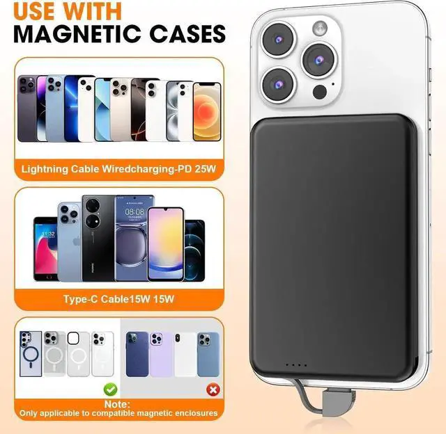 Tip: This power bank supports wired charging only not wireless. It provides 25W Lightning charging for iPhone 1216 series and 15W Type-C charging for Android devices. Magnetic cases are recommended for