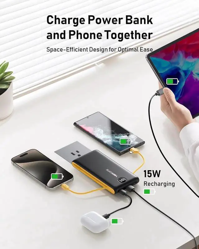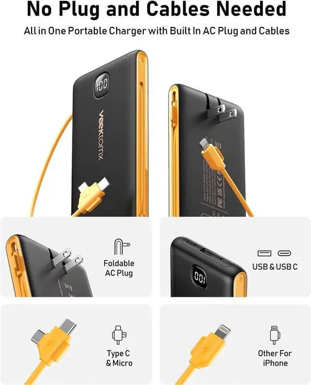 All-in-One Charging Hub: Simplify your charging routine with our 10 000mAh portable phone charger featuring built-in USB-C Micro USB and iPhone cables plus USB-C and USB-A ports. It's the ultimate all-in-one charging hub for every device in your life.