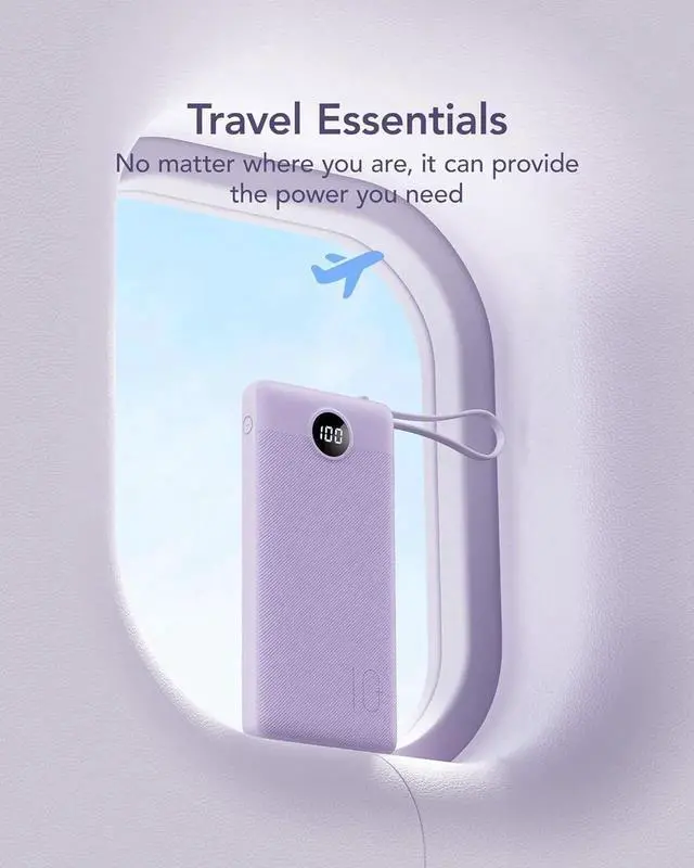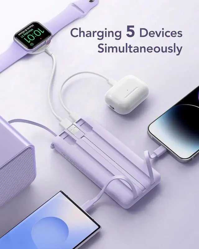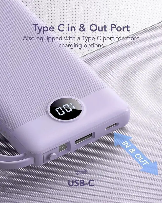 Charge 5 Devices Simultaneously: Total 5 output ports (built-in 3 cabls USB A and USB C port) supports charging for 5 smart devices simultaneously with each max 5V/ 2.4A output save you time and no more waiting. USB-C In & Out Port Design: Charge smarter not harder. The USB-C charging bank works as both input and output( 2.4A )replenish the power bank itself at high speed or use it to fuel your latest gadgets. No more charging chaos! built in smart LED display shows exact remaining power so youll always know when to rechargeTravel EssentialsNever run out of juice again! travel must have slim and compact battery bank only 5.7 x 2.57 x 0.72 in 9.17 Oz easy to put it in pocket. The portable lanyard design allows you to easily hang the power bank on your backpack or carry it in your hand when traveling. perfect for urgent needs or on-the-go lifestyles.