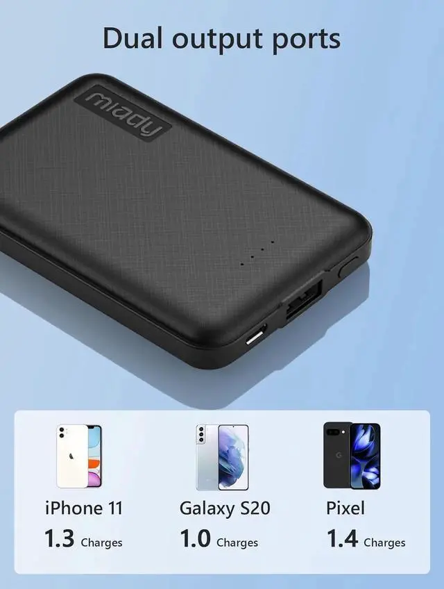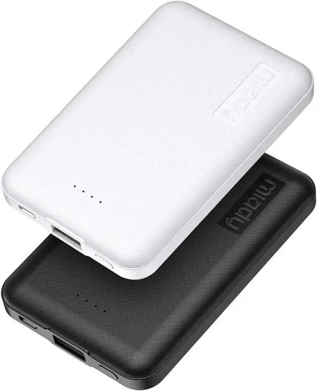 Super-mini Charger: Seamlessly fit Miady 5000mAh portable iphone charger for travel into your pockets or bags thanks to its compact dimensions of 3.6 * 2.5 * 0.4 in weight: 4.2 Oz. The lightweight design lets you take it out without pressure. Our 2 pack power bank would make a great gift for your families or friends.