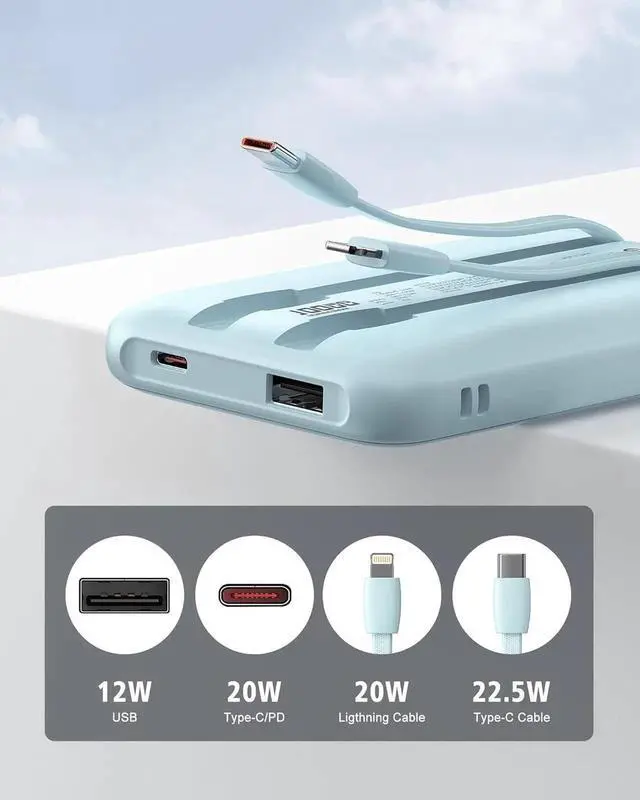 Built-in Dual Cables Features two built-in charging cables a Type-C cable and an iOS cable. This USB C battery pack is compatible with a wide range of devices including iPhone 14/13/12 series Google Pixel 7/6 Galaxy S23/S22 and more. Fast Charging Power Delivers 22.5W of high power allowing this power bank USB C to charge your phone up to 60% in just 30 minutes. Quickly restore your device's power and stay efficient. It is very suitable for your short distance travel shopping camping and daily commuting charging needs and is an essential item in your daily life.