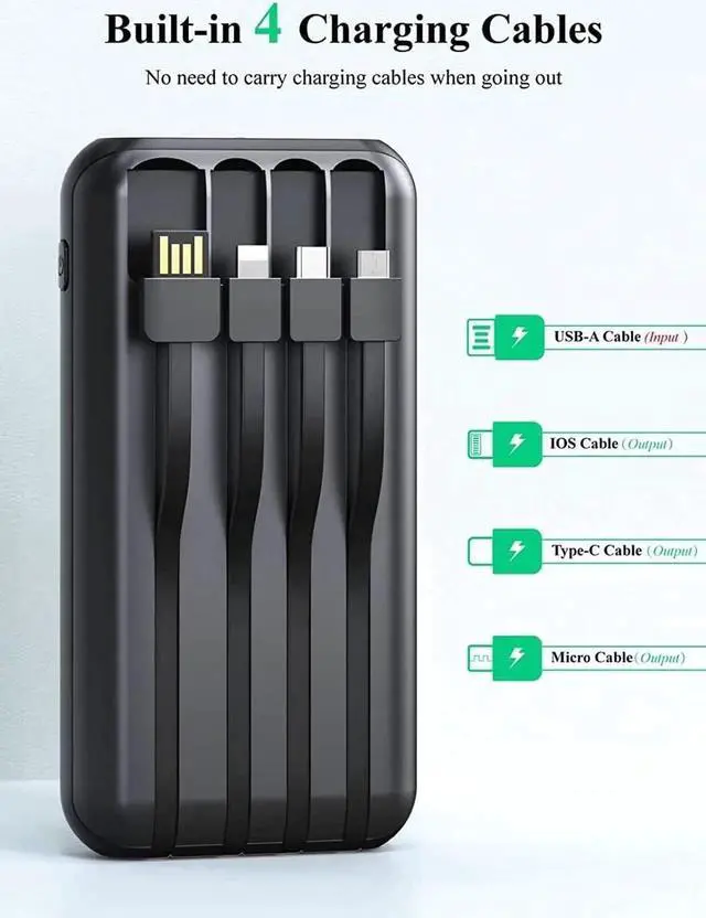 Portable charger can support charging four devices at the same time. Among them Type-C cable and USB-A output can provide 5V 3.1A high-speed output and micro and IOS cable can provide 5V 2.1A high-speed output. no worry about not being able to charge because forgot to carry cable. Power Bank Built in Three output cables and one input cable. Portable charger Built in Micro Type-C IOS cable for output. Also built in USB-A input cable for charging this portable battery. Just carry this product to get rid of a bunch of complicated cables allowing you to conveniently charge your phone anytime anywhere.