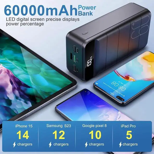 Portable Power Bank: This 60000mAh battery pack charger portable support over 15 charges for iphone 15 14 times for S24. Long-lasting can keep the power of your devices over a week. This large power bank perfect suitable for travel camping hiking vocation and other ourdoor activities 22.5W