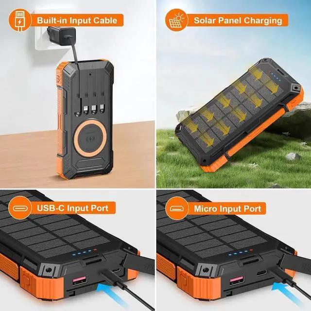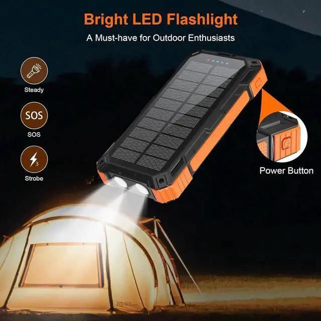 MULTI-PURPOSE OUTDOOR CHARGER: LUVKNIT portable solar power bank is made to be IPX5 waterproof dustproof and shockproof. The built-in dual super bright flashlights and the included compass carabiner can further ensure your safety when traveling outdoors making it an ideal companion for outdoor enthusiasts.