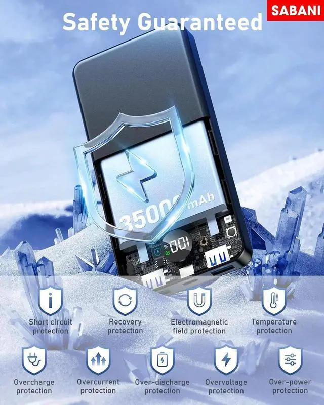 Battery Pack: SABANI portable battery has 10 layers of multiple system protection built-in low-temperature IC ice core intelligent monitoring of voltage and current actively avoid over-charge over-discharge short circuit high temperature and a series of potential dangers creating a safe charging environment for you.