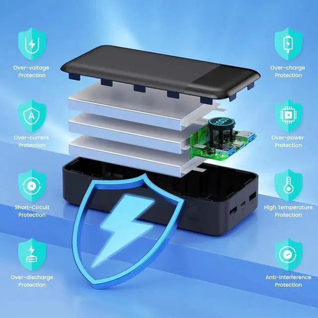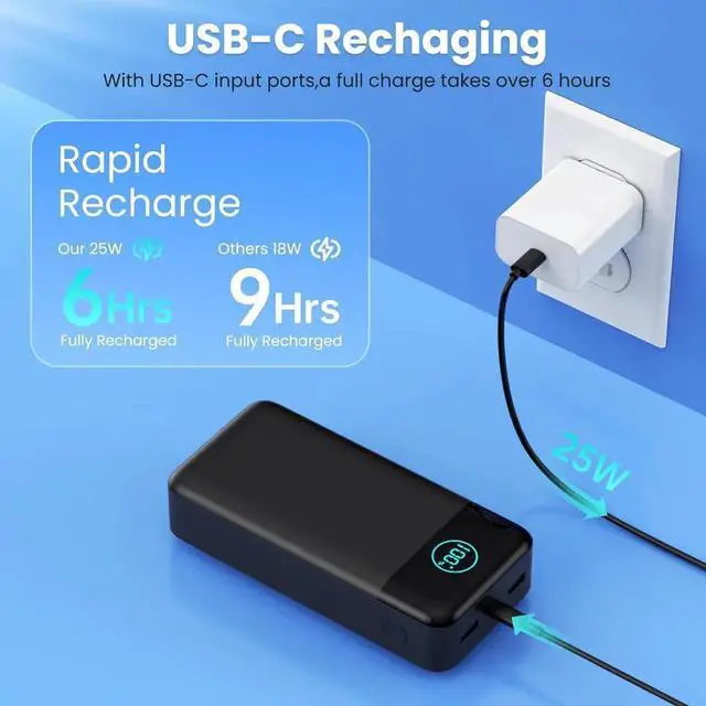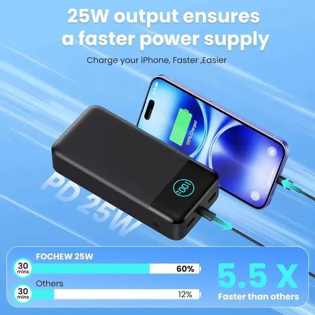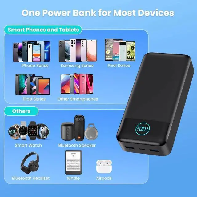(Please Note: 50800mAh power bank may not allowed on airplane please confirm further with your airlines)Latest 25W PD Super Fast Charging 50800mAh battery bank adopts the latest Super Charger Protocol and Fast Charger Protocol with 25W output USB-C port. Support QC 4.0 quick charging it only takes 20 minutes to charge your iPhone 15 from 20% to 60% which is 3 times faster than most ordinary old power bank on the market. Power 3 Devices SimultaneouslyPortable Charger Cell phone external battery pack is equipped with 2 USB-A ports and 1 USB-C port and it can charge 3 devices at the same time. The portable power bank is universally compatible with all products via USB charging cable including all iOS and Android smartphones watch Bluetooth headsets and so on. Universal CompatibilityThis portable charger widely compatible with iPhone 16/16 Plus/16 Pro/16 Pro Max/15/15 Plus/15 Pro/15 Pro Max/14/14 Plus/14 Pro/14 Pro Max iPhone 13/13 Pro/13 Pro Max/12/12 Pro/12 Pro Max iPhone 11/XR/XS Max/8/8 Plus/7/7 Plus/6/6s/6 Plus S23/S22/S21 Series Google Pixel LG Moto tablets Android phones smart phones and other devices such as earbuds Smartwatch Digital camera. ( (Not suitable for laptops) Safe and Secure Portable Bank ChargerThe portable phone charger built in quality batteries and comprehensive multi-protect safety system include Over-voltage Protection Over-current Protection Short-Circuit Protection Over-discharge Protection Over-charge Protection Over-power Protection High Temperature Protection Anti-interference Protection and more.