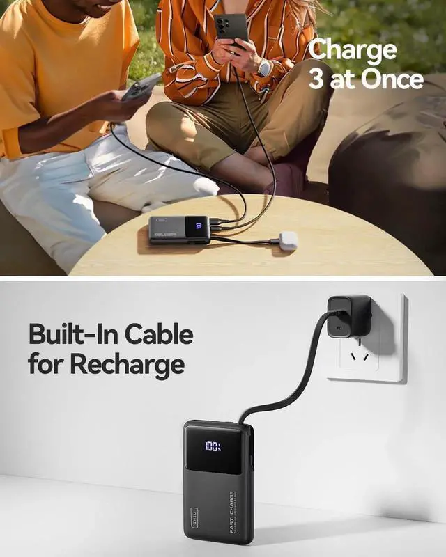 & S24: This power bank delivers up to 45W output and supports PD QC and other fast-charging protocols. In just 25 minutes it powers your iPhone 16 to 63% and charges your S24 Ultra to an impressive 73%. Grab & Go No Extra Wires Needed: This 10000mAh power bank with a built-in USB-C cable allows you to leave home without extra cables. The cable charges both your phone and the power bank itself and also serves as a lanyard to attach to your bag. 25% Smaller & 15%
