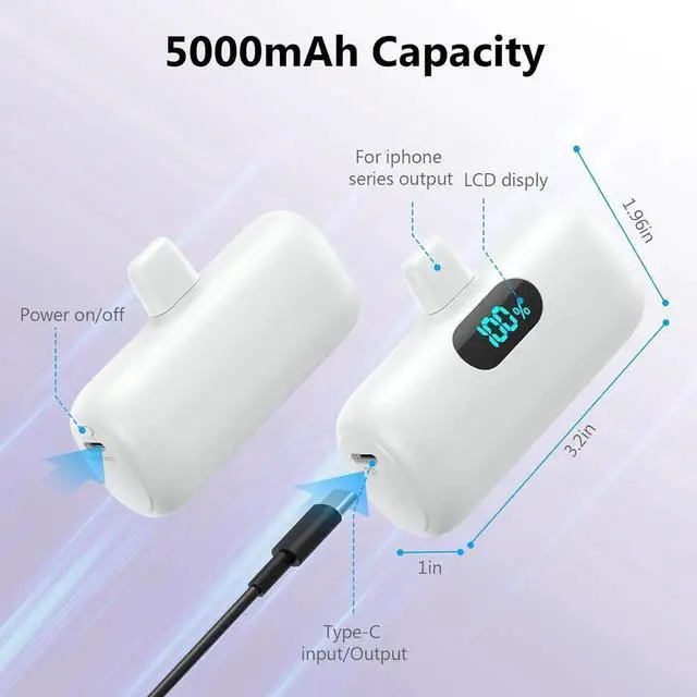 (Note: Not compatible with 16/16 Plus/16 Pro/16 Pro Max /iPhone 15/15 Plus/15 Pro/15 Pro Max)Portable Plug-in power bank for iPhoneIf you are a fan of iPhone and tired of carrying cables this mini portable charger is definitely best choice for you. Super small and lightweight single unit dimensions is only 81.84 * 50.63 * 25.8 mm ( 3.2 ''x 1.96 ''x1'') single unit only weigh 0.22 lb and no need cables. Multiple protection and Practical Pass-Through TechnologyThis Power bank built-in intelligent chip can protect your devices against over-discharge over-charge short-circuit or overheating. Battery Pack supports pass-through charging when recharging power bank you can charge your iPhone with a single press of the power button. 2 Packs of 5000mAh Portable Battery Backup ChargerSingle power bank is 5000mAh ( 3.7V Battery) best emergency battery pack for iPhone normally 0.8 ~ 1.2 charge for your iPhone. Dual Input and Smart LCD DisplayDual Input(type-C 5V/ 3.0A + Other 5V/2A). you can use your type-C Cable (Package Included) or iPhone cable to charge this mini power bank. Smart LCD display make it easy to know how much battery is left.