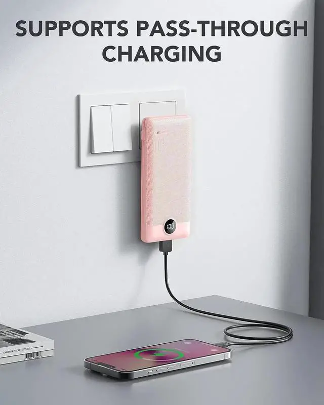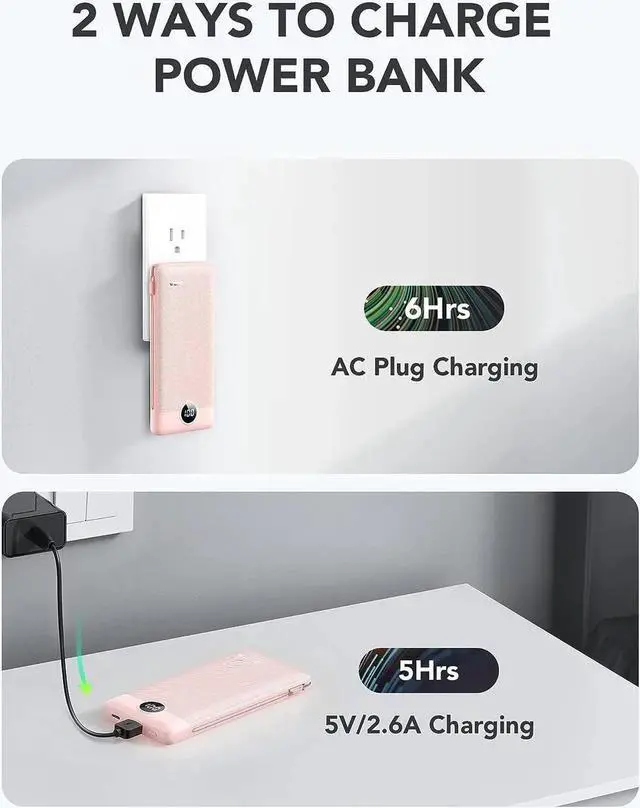 [Portable Charger With Built-in Cables and AC Wall Plug] This portable charger is not only has a built-in Micro cable USB C cable and other charging cable for iPhone but also is equipped with a USB port and USB C port. Also Portable phone charger is built-in wall plug that charges the power bank itself directly from the wall outlet. [Slim & Compact Design] Portable charger dimension is 5.9 x 2.8 x 0.7 in weighing 8 Oz. Compact design is more convenient for us to carry on the go and does not add any weight. [Smart Digital LED Display] You can know the remaining power at a glance via LED Display.