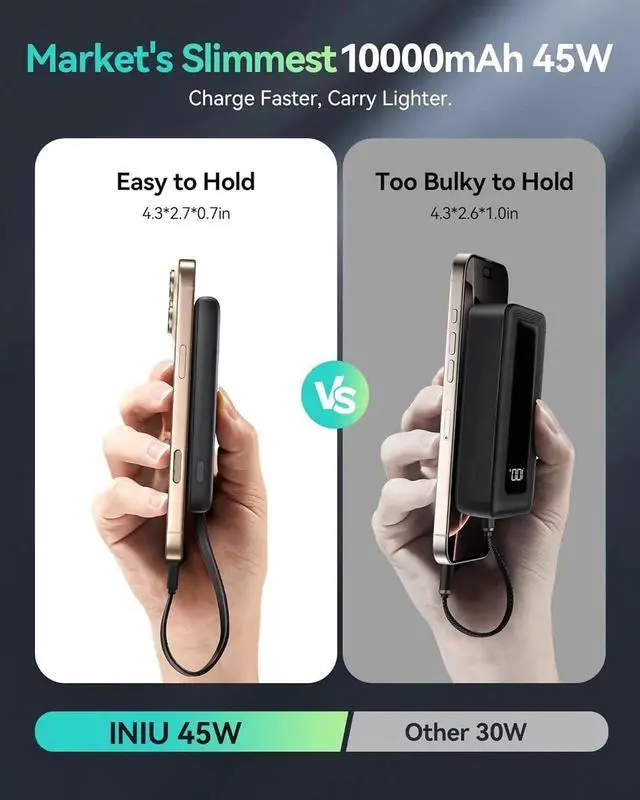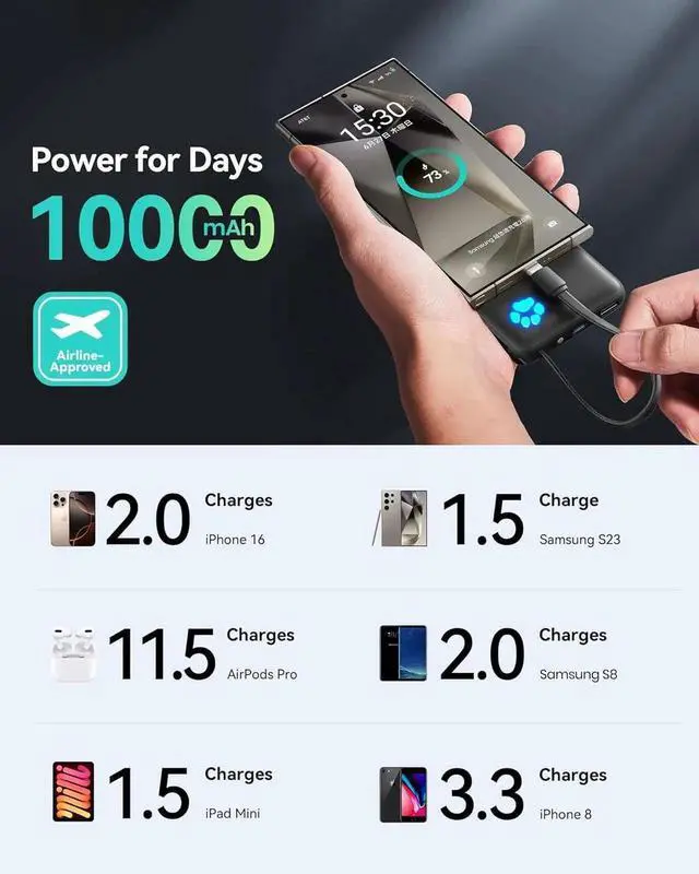& S24: This power bank delivers up to 45W output and supports PD QC and other fast-charging protocols. In just 25 minutes it powers your iPhone 16 to 63% and charges your S24 Ultra to an impressive 73%. Grab & Go No Extra Wires Needed: This 10000mAh power bank features a built-in USB-C cable that charges both your phone and the power bank and doubles as a lanyard. Leave home without extra cables. 25% Smaller & 15%