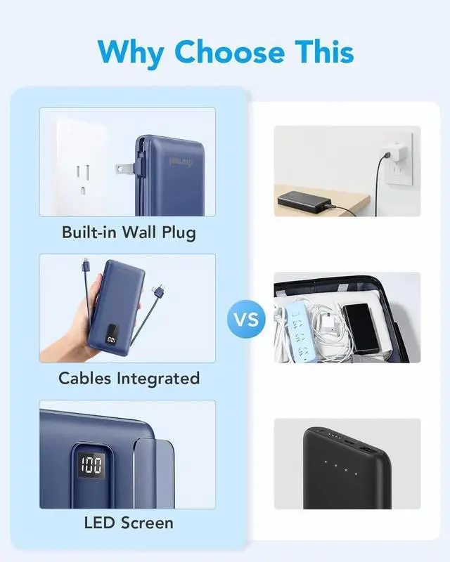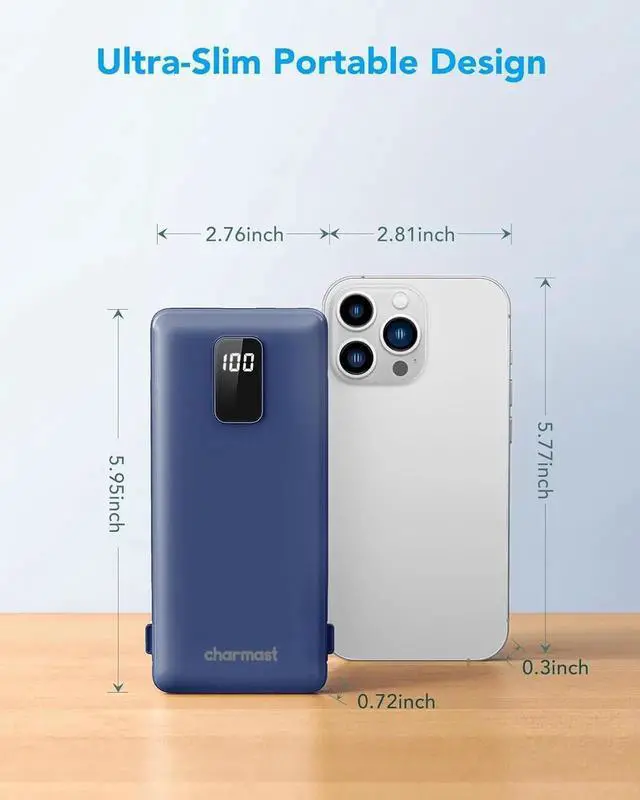 Say goodbye to tangled wires and multiple chargers with the Charmast Portable Charger. Its built-in cables make it compatible with iPhone 16/16 Plus/16 Pro/16 Pro Max iPhone 15/14/13 Series Galaxy all cellphones so you can travel light without worrying about charging issue. The built-in wall plug enables direct recharging of this battery pack from any wall socket with built-in cables for added convenience. This makes it a handy portable phone charger for your family and friends suitable for camping hiking and traveling. Despite its features this slim portable charger is designed to be fast charging measuring just 5.95 x 2.76 x 0.72 and weighing only 0.5 lbs less than the weight of a cup of water.
