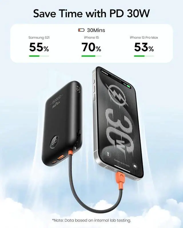 Super-Fast Charging: Charge your devices quickly with our cutting-edge 30W technology; compatible with PD 3.0 and QC 3.0 this portable charger outpaces typical 20W and 22.5W options delivering a faster and more efficient charging experienceBuilt-In Cables for