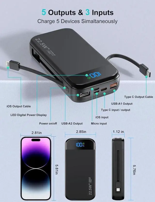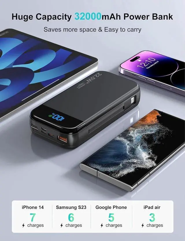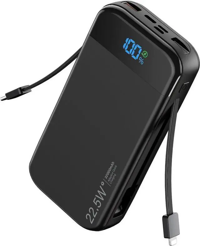 Huge Capacity: Our 32000mAh portable battery using the new high-density polymer battery it has a larger capacity under the same volume. perfect for a business trip or on the go you don't have to worry about your phone low battery; Power bank built in cable with LED display shows the remaining battery and the low power remind will let you know when need be recharged. Portable charger with built in cables: Our portable battery charger built-in 2 cables The integrated cables with grooves are convenient for storage more than 10 000 bending tests prove its durability tear-resistant bend-resistant; suitable for most smartphones or other devices no worry about the cables when going out.. Suit for iPhone iPad and other USB C port phones tablets and also for Micro devices. 5 Outputs and 3