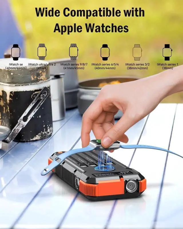 Wireless Watch Charging: The wireless watch charging function of this solar power bank is compatible with Watch series 9/8/7/6/SE/5/4. Place your device in the wireless charging area and you can charge it immediately. Make your charging method more convenient.