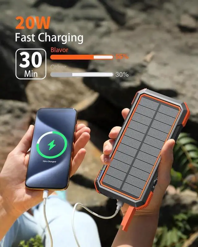 Sturdy Durable Super Bright Flashlight: The solar power bank is made of sturdy ABS material with anti-fall thick silicone in each corner. The charging port is also protected by a silicone cover. Anti-fall/dustproof/waterproof design the battery pack contains an LED flashlight and thermometer the lighting lasts up to 120 hours playing an important role in outdoor emergencies if you are an outdoor enthusiast don't miss this power bank.