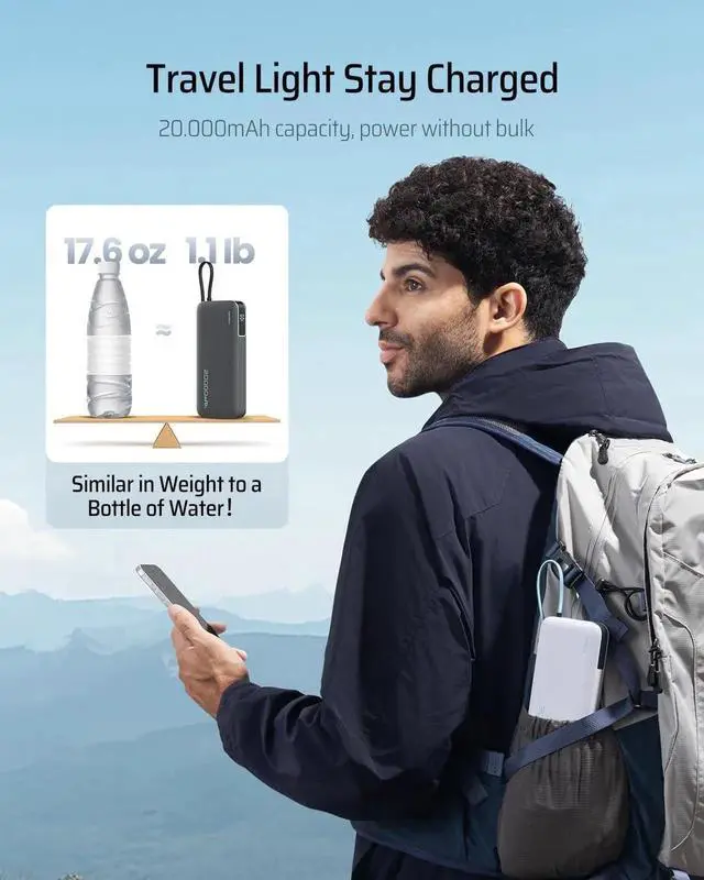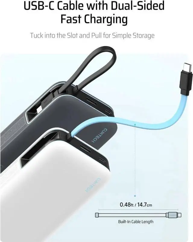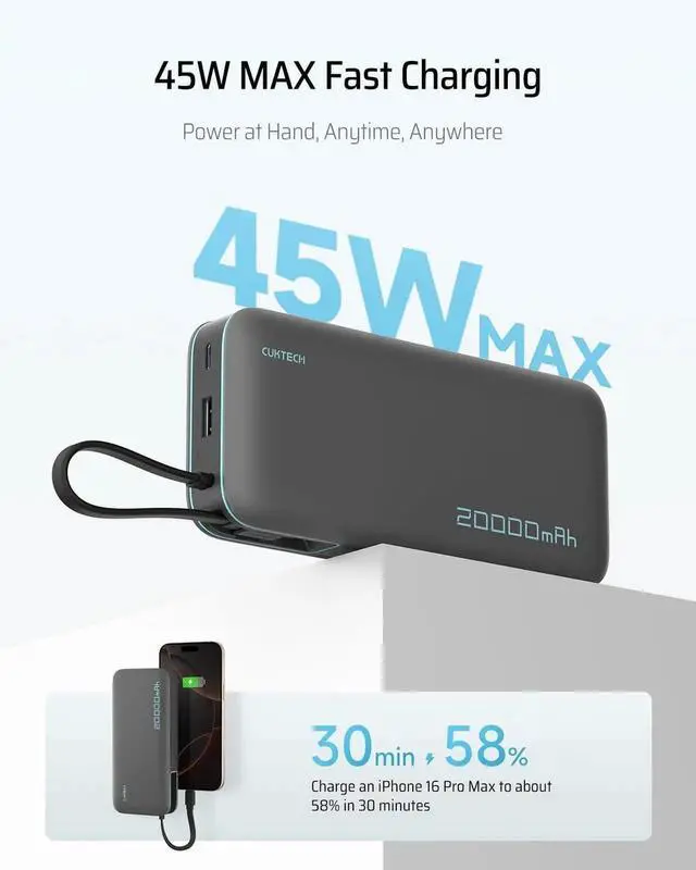 45W MAX Super Fast ChargingThe CUKTECH 20 000mAh power bank provides rapid 45W MAX output swiftly charging devices such as the iPhone 16/15 Pro Max MacBook Air and Galaxy S24 Ultra. This portable charger can charge the Galaxy S24 Ultra to 50% in just 20 minutes. Built-in USB-C Cable for Fast-ChargingDitch the cable clutter! This power bank features an integrated USB-C charging cord tested to withstand 10 000+ ensuring durability that matches your adventurous lifestyle. It can also serve as a carrying strap for easy portability in backpacks or pockets. Supporting 45W MAX high-speed charging delivers about 50% charge to Galaxy S24 Ultra in under 20 minutes.
