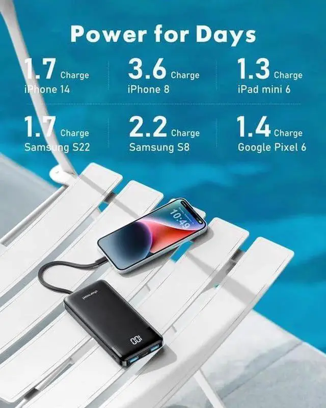 With digital led display feature no more hassle of guessing the remaining battery and you can recharge battery pack in time conveniently. A best portable charger for all people.?? Universal compatible with All popular devicesAs portable phone charger builts in all ports multi cables it is widely compatible with all popular cellphones or tablets. Widely compatible with iPhone 13 12 11 8 7 Series XR XS Max compatibel with S22 S21 S20 A52 A32 Z fold series Z flip series and compatibel with Google Pixel series and other android phones tablets etc...