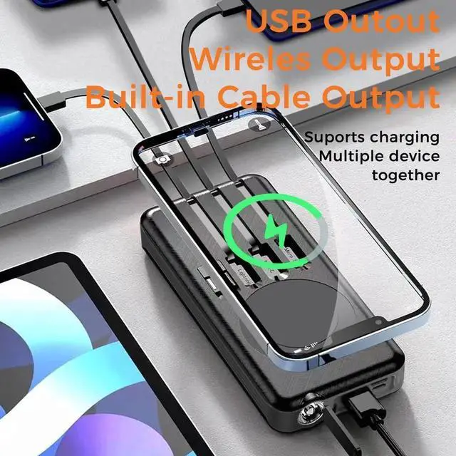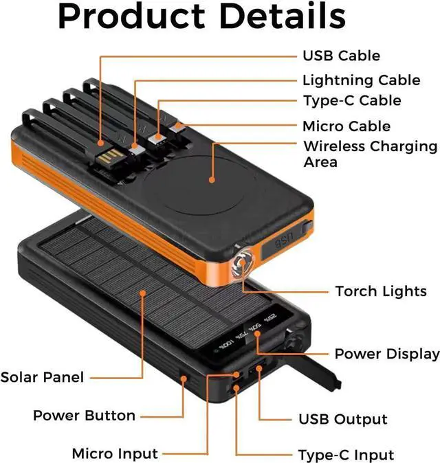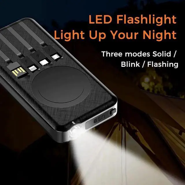 10 000mAh High Capacity Battery Stay powered on the go with this portable solar power bank featuring a 10 000mAh rechargeable battery pack. It can charge most smartphones up to 2.5 times making it a reliable choice for camping travel and outdoor adventures. Equipped with 4 built-in USB Mini USB Lightning and Type-C cables plus wireless charging it eliminates the need for extra cords and supports multiple devices at once. Dual Charging Modes Designed for convenience this solar charger power bank supports both USB fast charging and solar charging. Use a standard wall outlet for daily charging or rely on the solar panel as an emergency backup when youre outdoors.