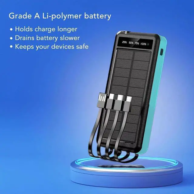 Four built-in cables: With USB Micro USB Lightning and Type-C cables all built in this solar charger power bank is ready for any device you throw at it. Perfect for family trips or just cutting down on clutterwhatever device you need to charge our solar phone charger is compatible.