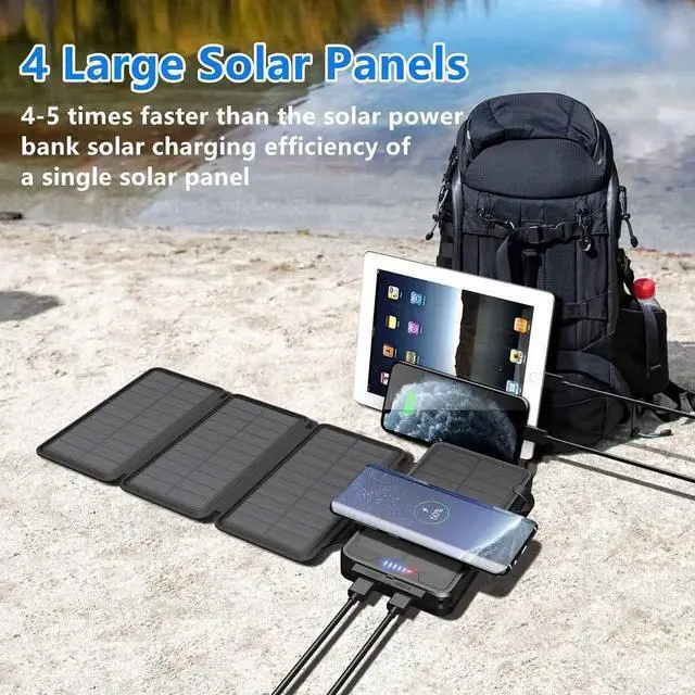 Solar power bank 38800mAh large battery let you get rid of the anxiety of battery power anytime and anywhere. Solar power bank has a wireless charging function two 5V 3.1A USB fast output ports can charge up to 3 devices at the same time.