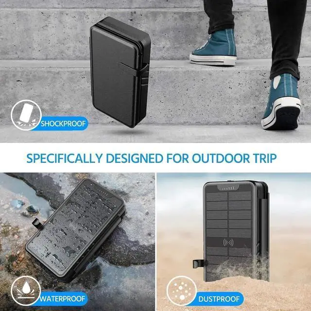 Note: Only Qi-enabled devices are compatible with wireless charging. Power bank is waterproof drop-proof and dust-proof and can still work normally in extreme environments. The power bank has four solar panels with a built-in power of about 2W. solar panel after the ideal sunlight in parallel arrangement of the circuit will produce a maximum of 5.5V / 1.5A input. It can exceed the input of the old 5V1A charging head. But solar charging for emergency use to ensure battery life it is recommended that daily use of cable charging. Solar power bank has a built-in smart chip that can automatically identify and be compatible with different devices convert fluctuating voltage into stable voltage stabilize the device and ensure safe use.
