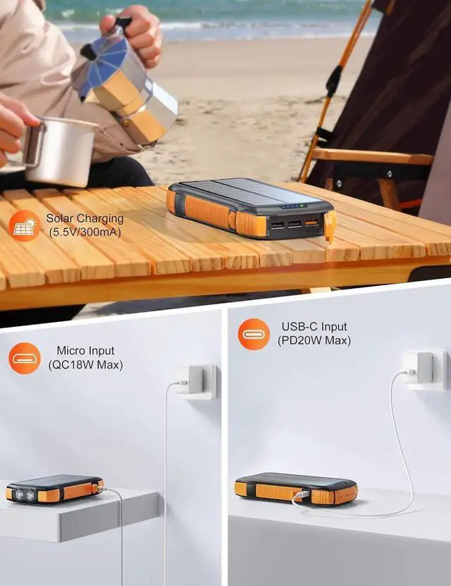 Ultra High Capacity-Solar power bank inbuilt 40000mAh Li-ion battery cells over 1200 times recharging cycle. It's features a premium high-density Li-polymer battery and equipped with smart protection IC chip making it more compact and safer than other power banks. Equipped with solar panel just hang it on your backpack to get recharge via sunlight It's perfect for outdoor activitiesSuper Fast Charging-with QC 3.0 20W USB A1 and PD 20W USB C output port 15W wireless charging (NOTE: Short press before use). Micro and Type-C dual input only need 6H to refuel by 20W adapter this solar portable charger can charge 5 mobile devices syncPowerful Led Flashlight-4W 300 lumen 25H (strong) /40H (soft) working long range focusing lighting cup reach 165FT distance solar battery bank has strong/ soft/ SOS/ strobe four modes helps you send emergency signals. Widely for camping hiking car repairingRugged Structure-The outer case is made of flame-retardant ABS and PC materials. anti slip for firmly grip The waterproof silicone better protects the internal structure of the charger. Rubber skin-feel oil coating process to form a protective film on the surface comfortable touch and exquisite appearance. Equipped with a strong microfiber self adhesive lanyard easy to hang on your backpackWhat you get-1X 40000mAh Solar Wireless Charger 1X USB C Cable (50cm) 1X User manual and friendly customer serviceKindly Remind-Mono-crystalline solar panel is a backup power when other sources out solar charger efficiency is influenced by weather season geographic latitude altitude atmospheric mass please full charge this solar phone charger before outside