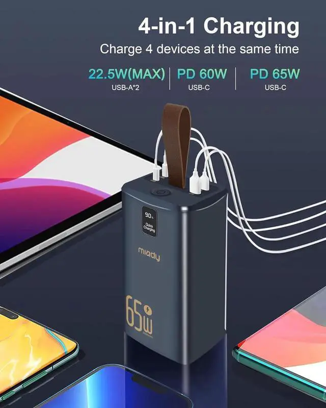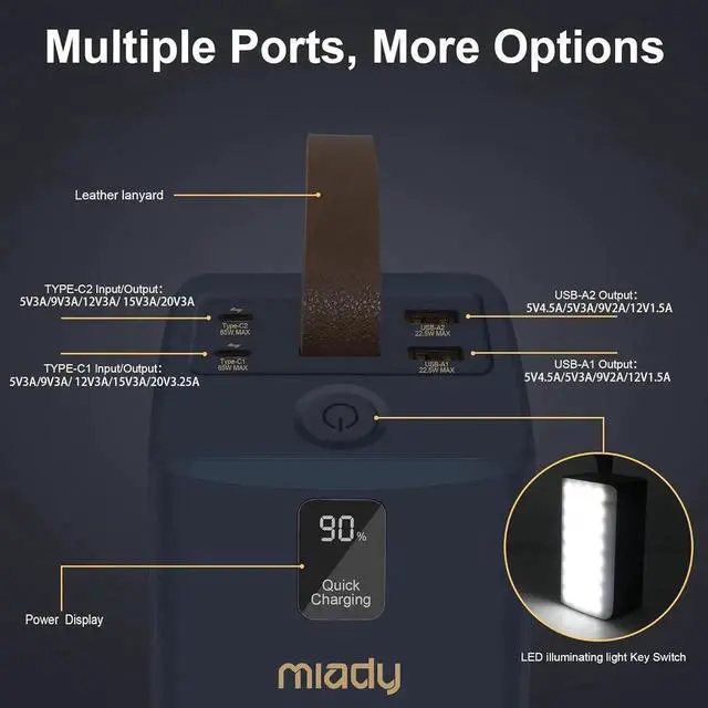 Capacity 50 000mAh: There's nothing more annoying than a random blackout considering how much of our lives depend on electricity. So when you have Miady 50000mAh power bank you no longer need to panic in the case of power outage or hurricane season. The built-in 32 LED beads that will light up the room sufficiently without having to use dangerous candles. It is great for certain uses and will provide enough juice for camping trips beach rustic travel or emergency use. Unrivaled 65W PD