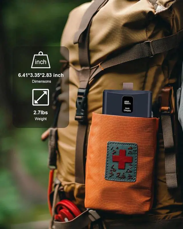 Digital Display: 65w portable battery pack with reassuring digital LED display feature easier for you to know the exact power of the charging bank (rather than relying on counting blinking lights to guess). Besides the external battery power bank does have a flexible handle if you need to get mobile. While the unit itself is fairly hefty ( 2.7 Lbs) it's also fairly compact so it won't take up a whole lot of space.