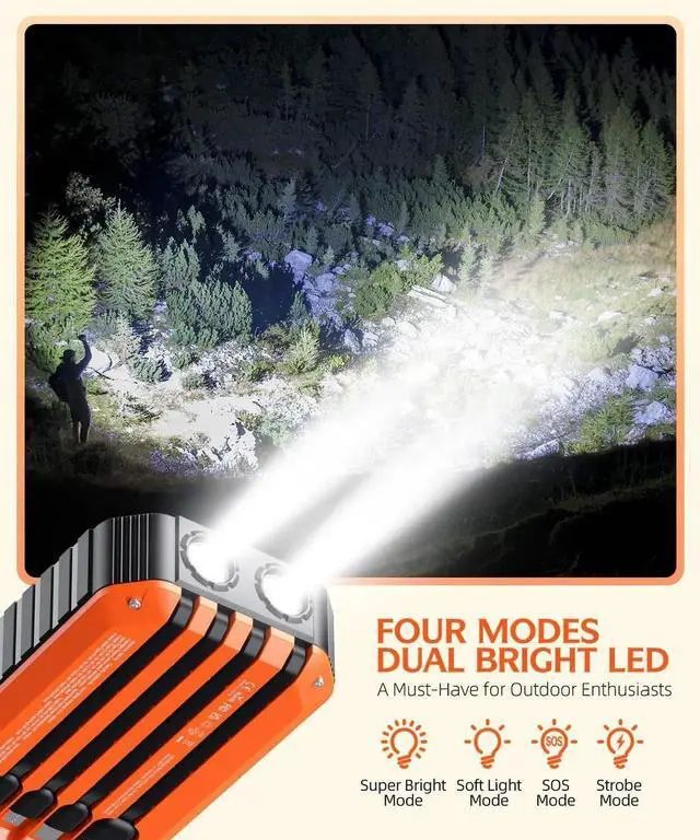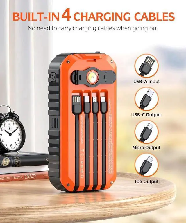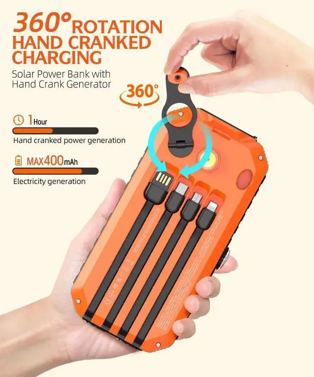 (Note: The hand crank generator and solar charger are only for emergency function please do not use them as the main charging method. It is recommended that daily charging through the plug is beneficial to the life of the power bank). Portable charger has built-in Micro Type-C IOS cable for output and built-in USB-A input cable for charging this Portable charger. Meanwhile Portable charger is equipped with three output ports: USB1 for 22.5W fast charging Type-C port for PD20W fast charging and USB2 port for 10W output. Just by carrying this product you can get rid of a bunch of complicated and redundant cables allowing you to easily charge a variety of mobile devices and share the charging with your friends. Solar power bank built-in super bright flashlight has 4 light modes (Super Bright / Soft / SOS / Strobe) which can be used as a camping light emergency light and rescue signal light. In addition this rechargeable power bank also has a built-in compass leveling device and solar panel so it can be hung on your backpack and recharged by the sunlight to get a certain amount of power. Great for outdoor activities such as camping hiking and other emergencies. Solar power bank treasure is made of high quality engineering ABS material with corrosion resistance heat resistance high surface hardness high elasticity and toughness of the excellent performance. And with the sealing process IP67 waterproof shockproof and dustproof it can still function properly in harsh environments.